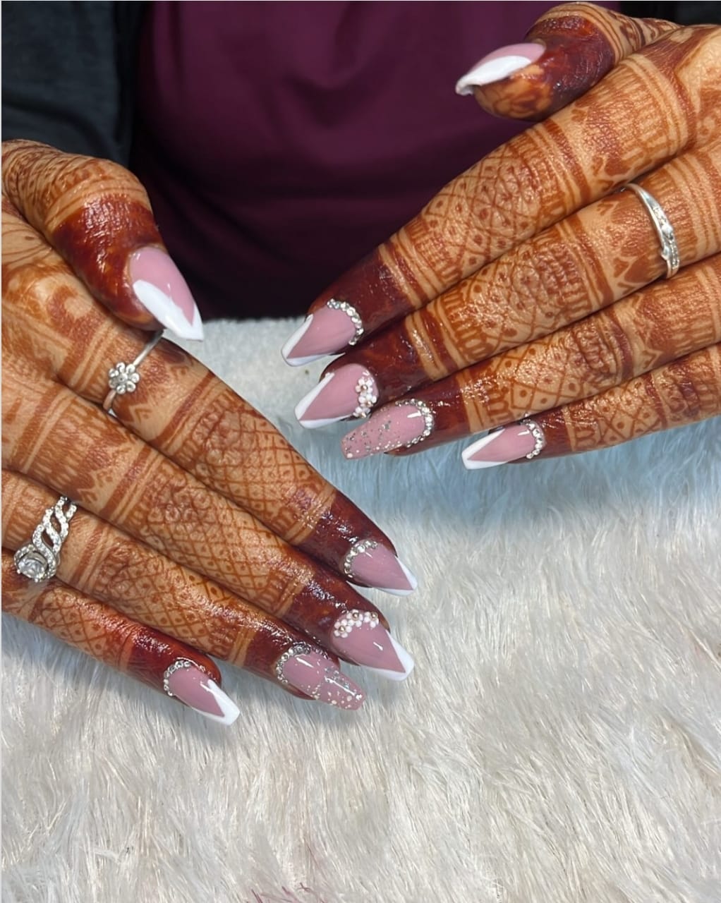 Soft blush pink nails with elegant French tips, adorned with glitter and stones for a perfect bridal glam look.